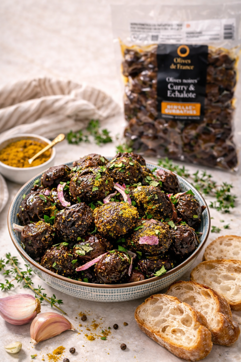 Ingrédients: olives noires de France 89%, huile de colza, curry (coriandre, curcuma, moutarde, laurier, cumin, fenouil, piment fort, céleri) 2.2%, échalote 1.5%, persil, sel.