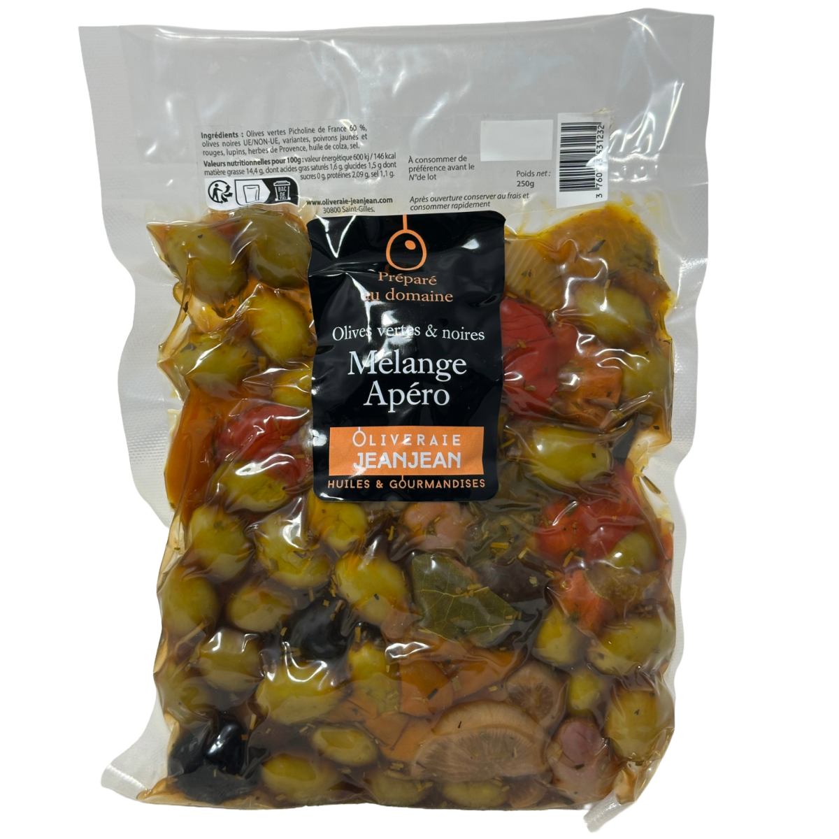 Ingrédients : olives vertes origine France variété picholine 60%, olives noires et olives roses origine UE/NON-UE, variantes, poivrons jaunes et rouges, herbes de Provence, huile de colza, lupins, sel