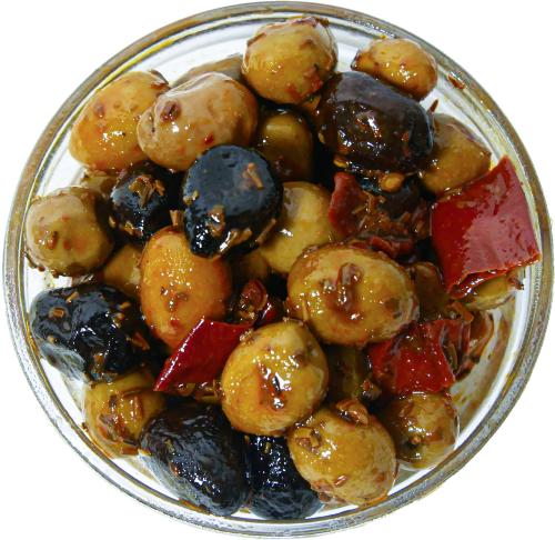 Coté Cuisine...olives vertes et noires préparées avec de l'harissa et du piment rouge coupé en morceau, elle sont idéales pour un apéritif festif.